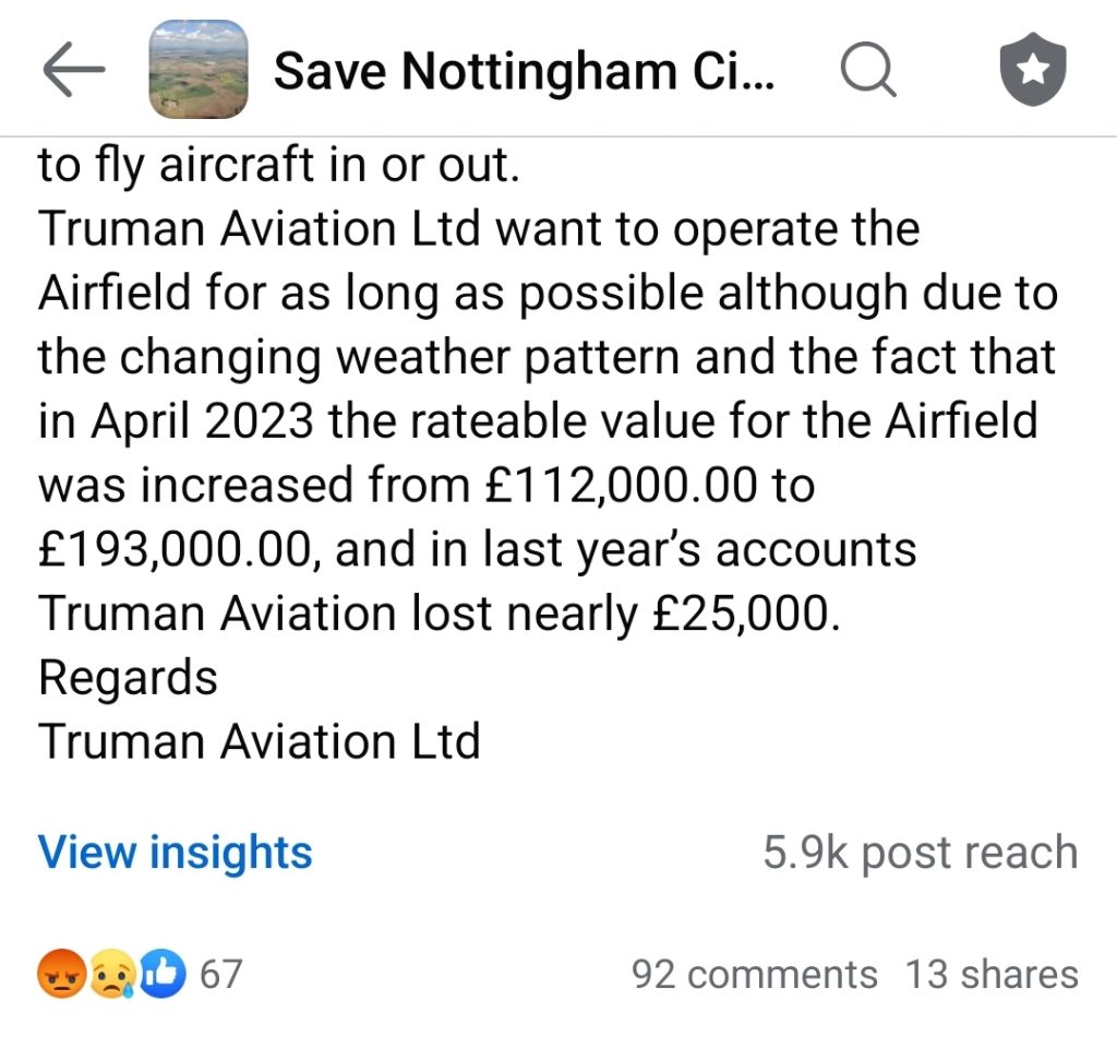 Notts TV asked Truman Aviation Ltd for a statement to explain things which, surprisingly, wasn’t forthcoming. The words ‘It was discussed’ were uttered, without clearly stating who discussed it and with whom it was discussed. The enquiring minds have gone back to Vistry to see if indeed this course of action was ever discussed with them.